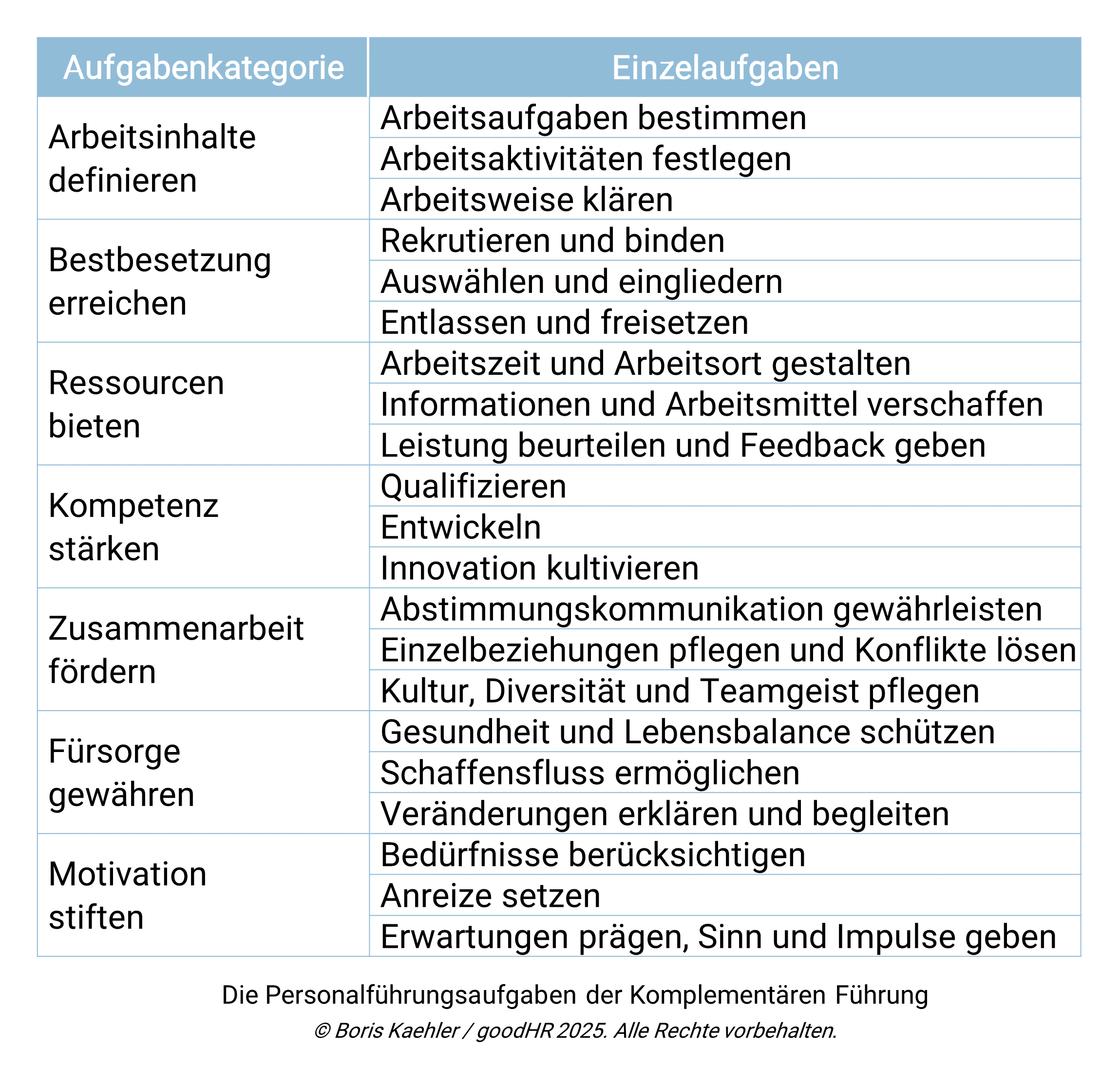 Das Komplementäre Führungsmodell benennt sieben Kategorien von Personalführungsaufgaben mit jeweils drei Einzelaufgaben. Das Grundverständnis ist hier, dass es sich um personelle Leistungsbedingungen, also Voraussetzungen nachhaltig produktiver Arbeit handelt. Bezugspunkt dabei sind die einzelnen Personen.
