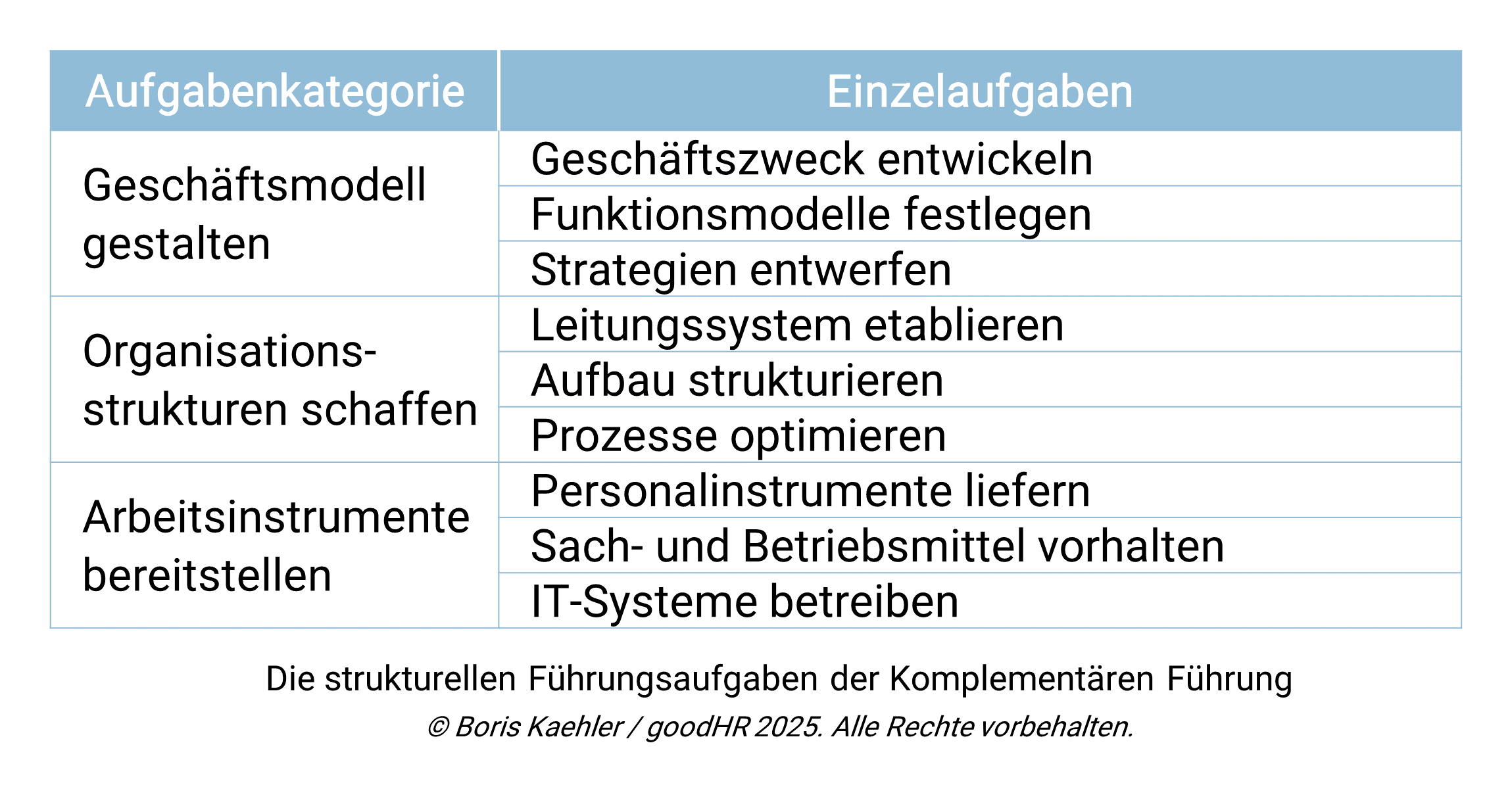Das erste Modellelement der Komplementären Führung sind die Führungsaufgaben. Sie benennen die Aufgabenstellungen, die es umzusetzen gilt. Strukturelle und personelle Führungsaufgaben ergänzen sich dabei komplementär, und wirksame Führung adressiert beide.