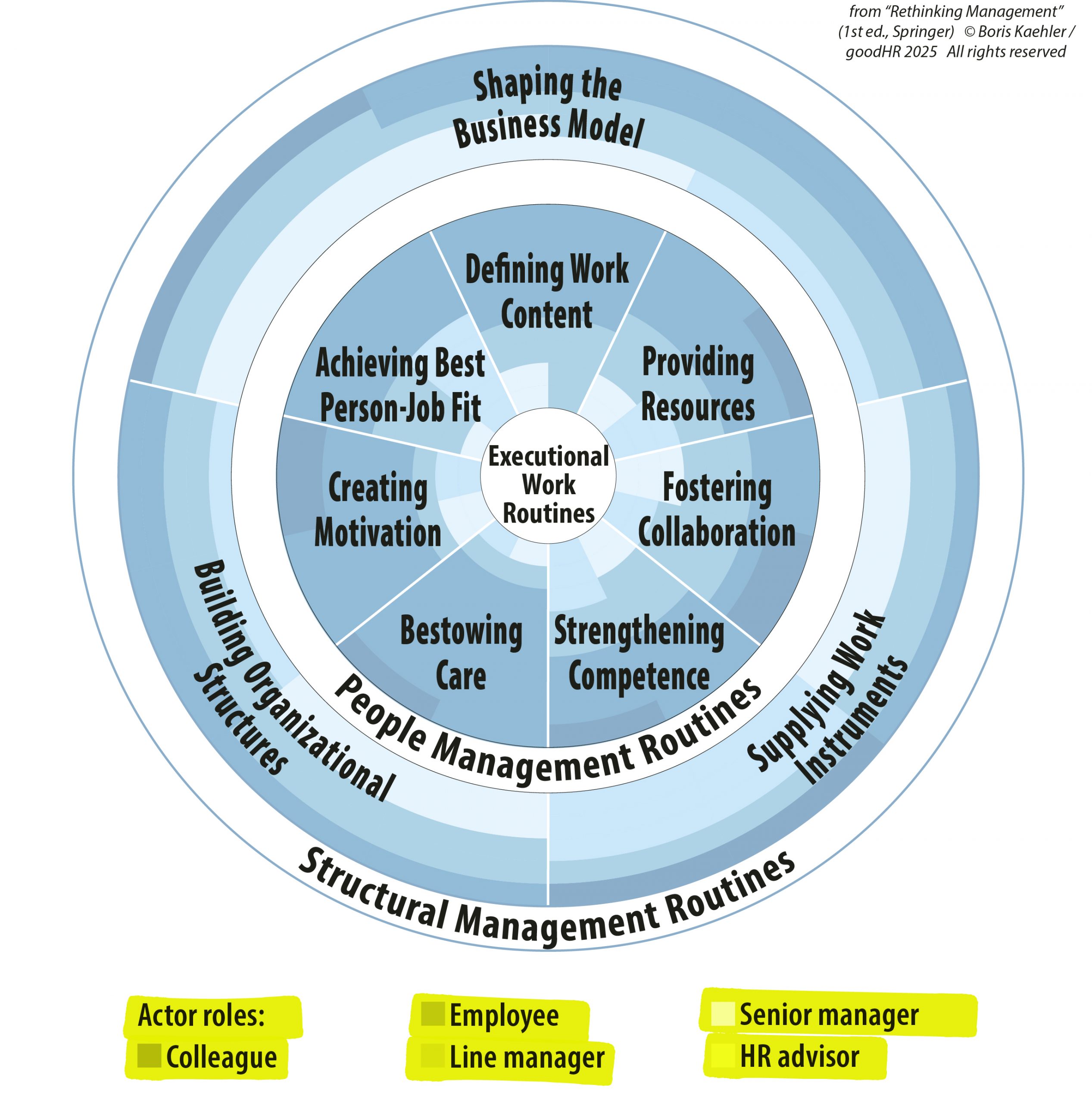Management and leadership is anything but trivial. One of the reasons for this is that it takes place on several levels simultaneously. For example, the employee role of clerks, production workers, etc. does not only involve self-management, but also, where applicable, participatory involvement in the management and leadership of higher-level organizational units. In addition, there may be lateral leadership of peers from a colleague role. Managers also do not just perform the role of manager, but also act as self-managers in their role as employees and as lateral leaders in their role as colleagues. Senior managers, who for their part manage other managers, are also required to perform this role. HR advisors also have three or more roles. This complicates matters, but simply describes reality. Management is always multiple management. Admittedly, the whole thing only becomes really understandable when you look at the »management routines«.