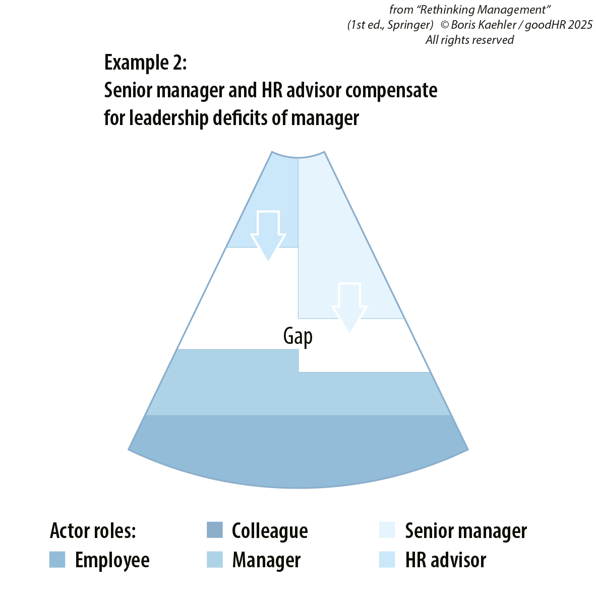 Of course, managers are only human, and management and leadership are just a job. Deficits are therefore to be expected. If management and leadership are to function effectively within organizations, additional compensatory mechanisms must be in place. The Complementary Management Model provides these mechanisms in the roles of senior manager and HR advisor. Both act in relation to the line manager as the line manager acts in relation to the employee. This means that they primarily rely on the line manager’s self-steering and intervene (only) when necessary. This creates a robust overall system that ensures that all management tasks are fulfilled with regard to all employees and organizational units.